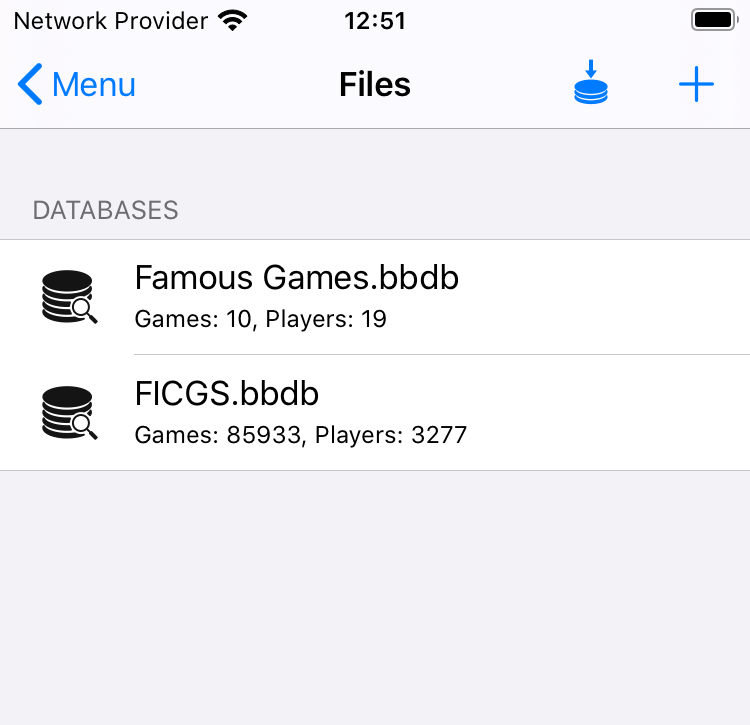 In der Ansicht der Datenbankauswahl werden alle im Dokumentenordner der App existierenden Datenbanken dargestellt. Außer der Anzeige der Namen, wird die aktuell vorhandene Anzahl an Partien und Spielern dargestellt. Es kann eine kurze Zeit dauern, bis diese Zahlen zur Verfügung stehen.